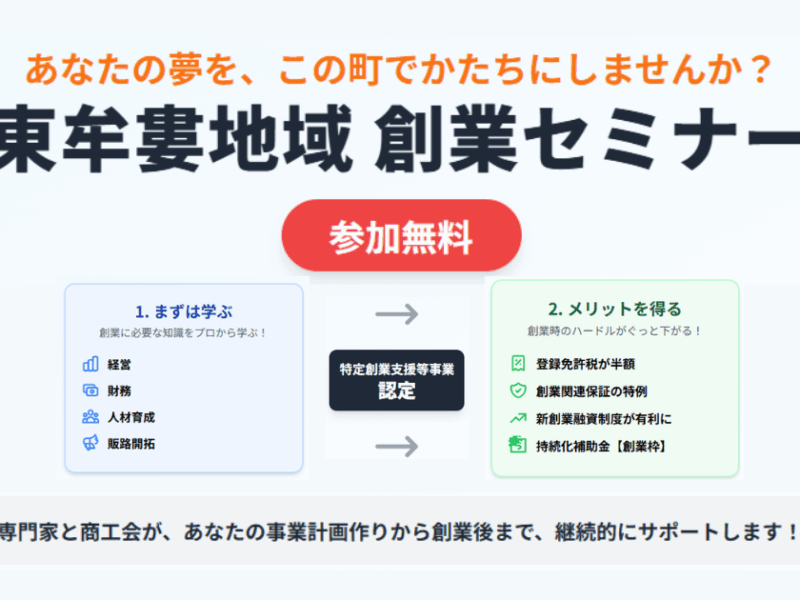 続きを読む串本町を含む東牟婁地域での創業を本気で応援!広域商工会東牟婁協議会が主催する無料創業セミナー。特定創業支援等事業の認定で、会社設立費用の軽減や補助金申請、融資が有利になります。専門家があなたの事業計画を徹底サポート。