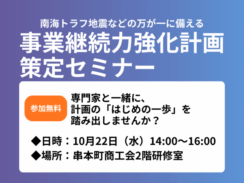 続きを読む【10/22開催】事業継続力強化計画(ジギョケイ)の策定でお悩みの串本町事業者様へ。専門家が基本から解説する無料セミナーです。補助金活用も学べます。お気軽にご参加ください。