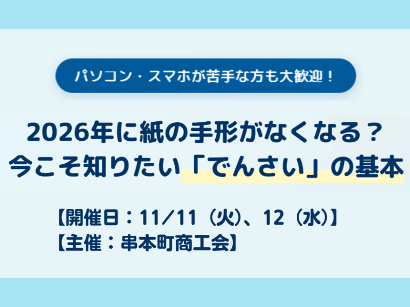 続きを読む2026年度末の紙の手形・小切手廃止に向けて、不安はありませんか?串本町の事業者様へ、「でんさい」の基本を分かりやすく解説。変化をチャンスに変える無料セミナーもご案内。商工会が全力でサポートします。