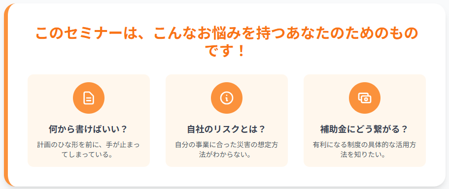 一つでも「あ、自分のことだ」と感じたなら、どうぞご安心ください。皆さん同じ悩みを抱えています。このセミナーは、そんな皆さんの不安を解消するために開催するものです。