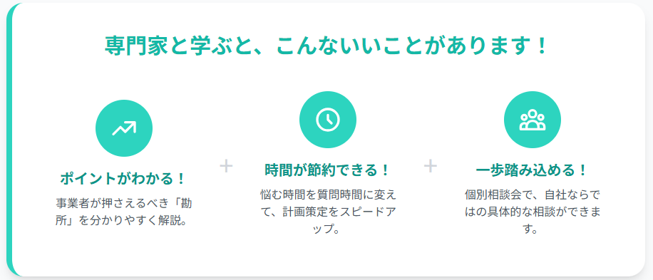 たくさんの事例を知る専門家から、私達小規模事業者が「まず、これだけは押さえておくべき」というポイントを、分かりやすく教えてもらえます。難しい言葉は使いません。