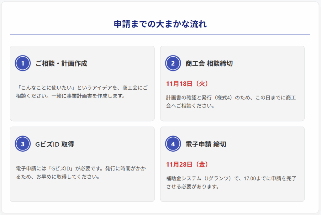 申請には、私たち商工会が発行する「事業支援計画書」という書類が必要です。この書類の発行には、皆さんの事業計画を一緒に確認させていただく時間が必要となりますので、最終締切よりも一週間早い、この日が商工会での受付締切となります。ご相談は、ぜひお早めをお願いします!