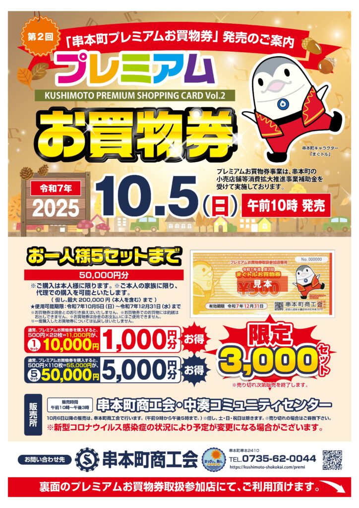 串本町商工会では経営に関するお悩みを相談できる環境を整えています。そして今回、地域経済の活性化と消費拡大を目的とした「第2回串本町プレミアムお買物券」を10月5日より販売しております。