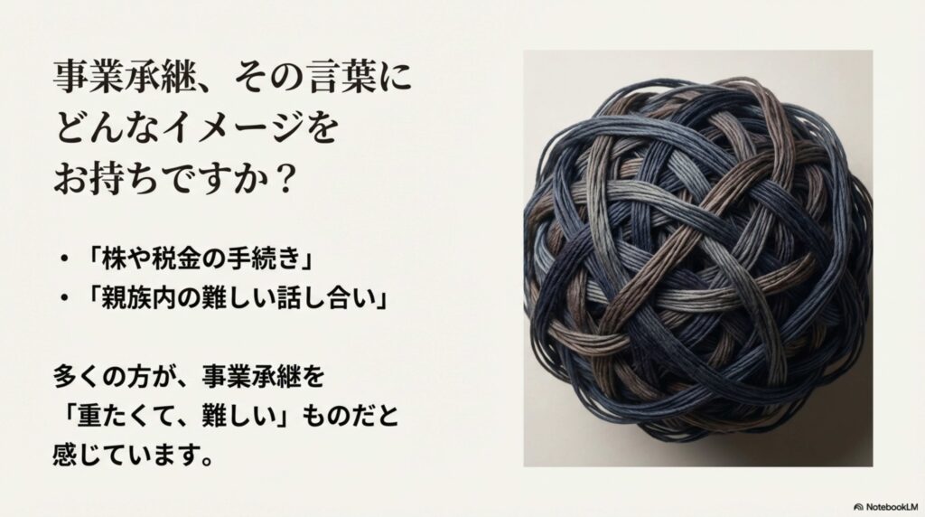 「事業承継」というと、どうしても「株や税金の手続き」「親族内の話し合い」といった、少し重たくて難しいイメージをお持ちではないでしょうか。しかし、今回の会場で語られていたのは、そうした事務的な話ではありませんでした。