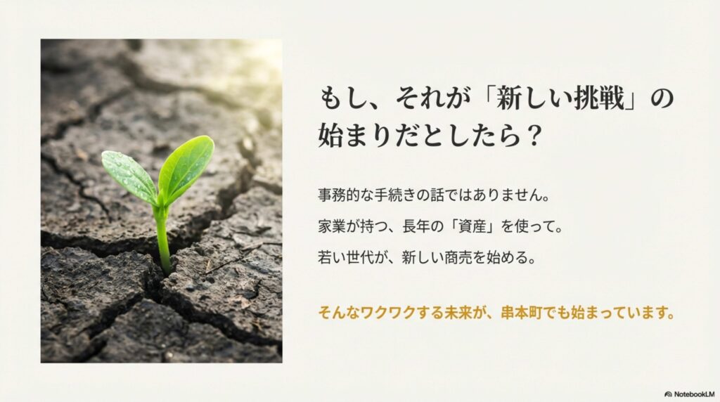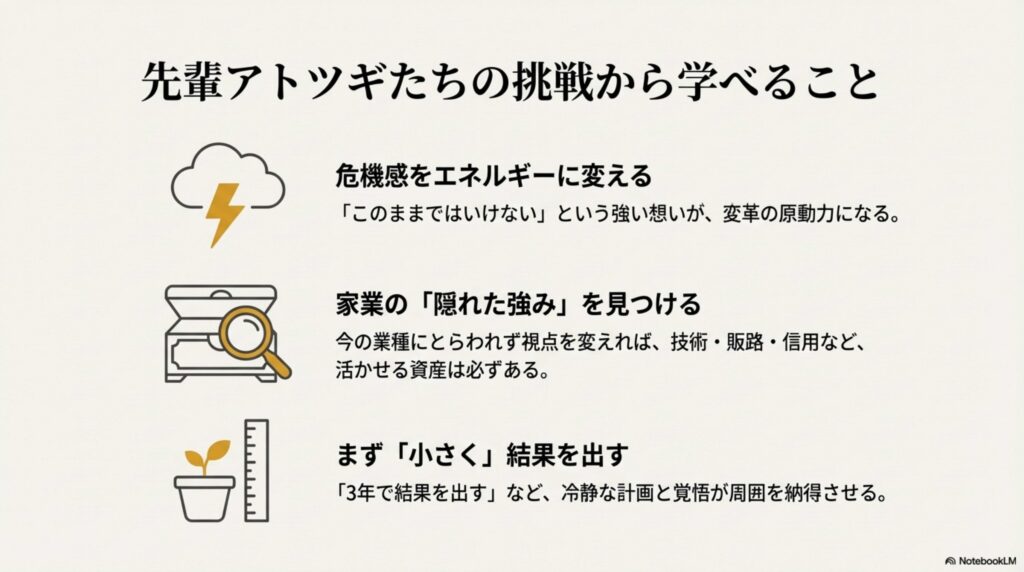 今の業種にとらわれすぎず、少し視点を変えるだけで、家業にはまだ活かせる強みがあるのかもしれません。