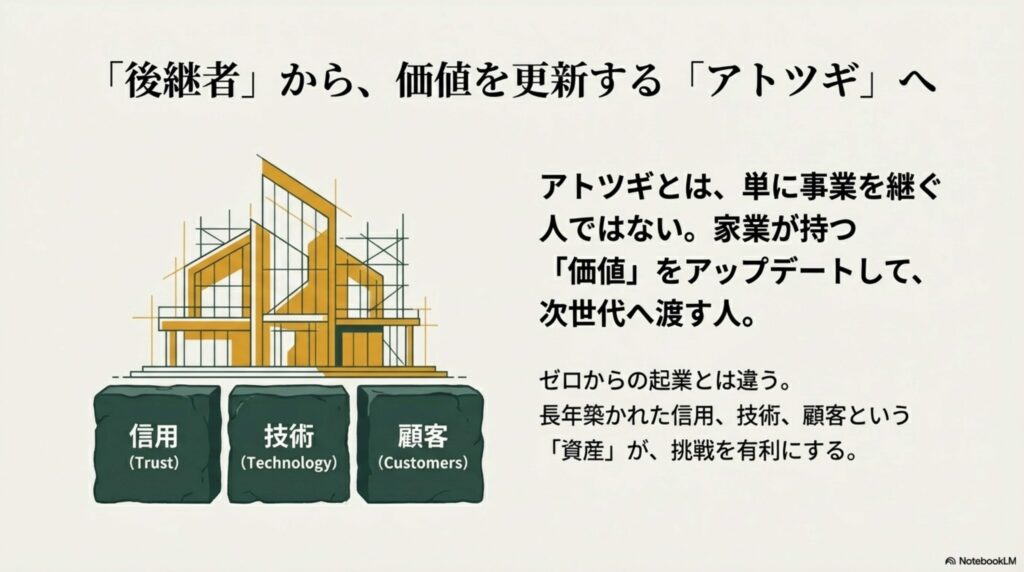 家業の資源を活かした「第2創業」という考え方 12月1日、和歌山市で開催されたセミナーに参加し、講師の森田さんがおっしゃった「アトツギの定義」にハッとさせられました。「アトツギとは、単に事業を継ぐ人ではなく、家業の価値をアップデートして次世代へ渡す人」だというのです。