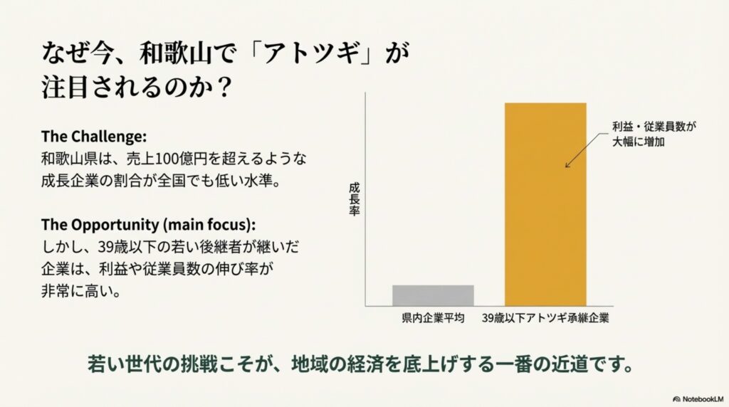 つまり、若い方が「アトツギ」として挑戦することが、和歌山の経済を底上げする一番の近道だということです。