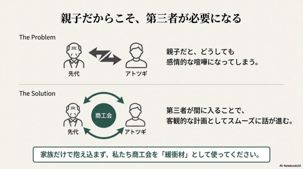 家族だけで抱え込まず、私たち商工会をうまく「緩衝材」として使っていただければと思います。