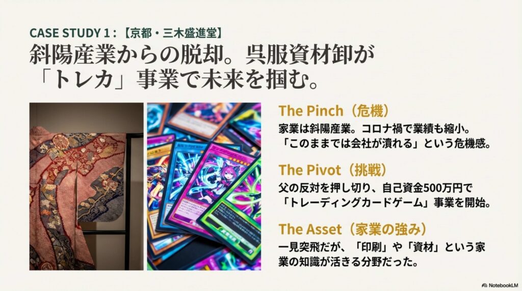 既存の販路を活かして全く別の市場へ挑戦 着物関連の資材卸を営む三木さんの事例は、非常に現実的でした。家業は斜陽産業で、コロナ禍で業績も縮小。「このまま継いでも会社が潰れてしまう」という危機感から、お父様に反対されながらも、自己資金500万円を使って「トレーディングカードゲーム」事業を始められたそうです。