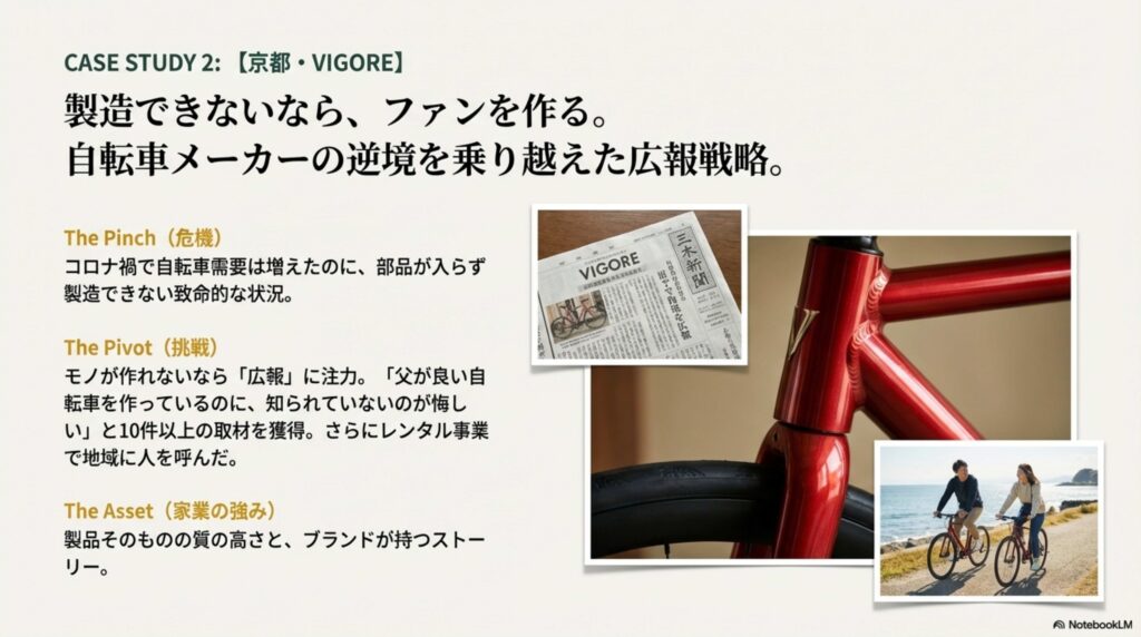 そこで取り組んだのは、なんと「広報」でした。「父が良い自転車を作っているのに、知られていないのが悔しい」と、10件以上の取材を獲得し、知名度を上げました。