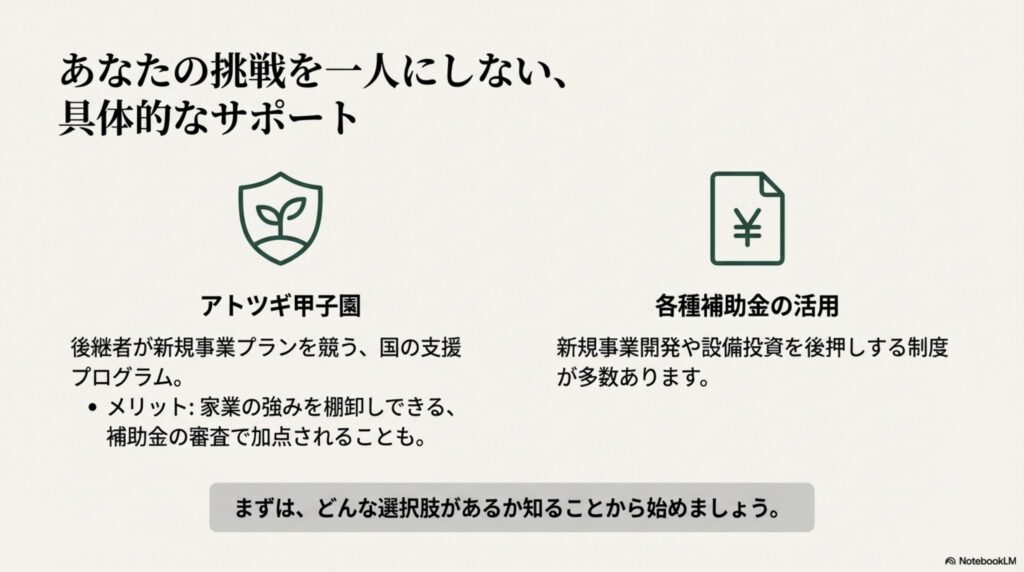 「アトツギ甲子園」や補助金の活用も。まずは商工会の窓口でご相談ください イベントでは、後継者が新規事業プランを競う「アトツギ甲子園」という国の取り組みも紹介されていました。これに参加することで、家業の強みを棚卸しできたり、補助金の審査で加点されたりと、多くのメリットがあるそうです。