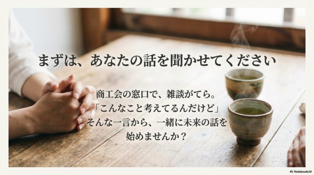 まずは商工会の窓口で、雑談がてら「こんなこと考えてるんだけど」とお話ししに来てください。一緒に未来の話ができれば嬉しいです。