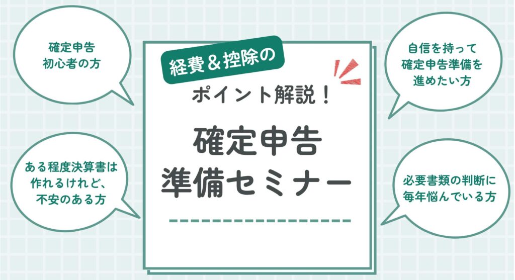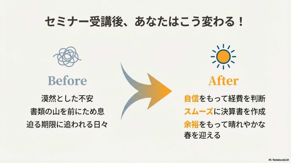 このセミナーを受ければ、「これは経費、これは違う」とご自身で自信を持って判断できるようになり、決算書の作成がスムーズに進むはずです。必要な書類もリストアップできるようになるので、申告直前に慌てることもなくなりますよ。