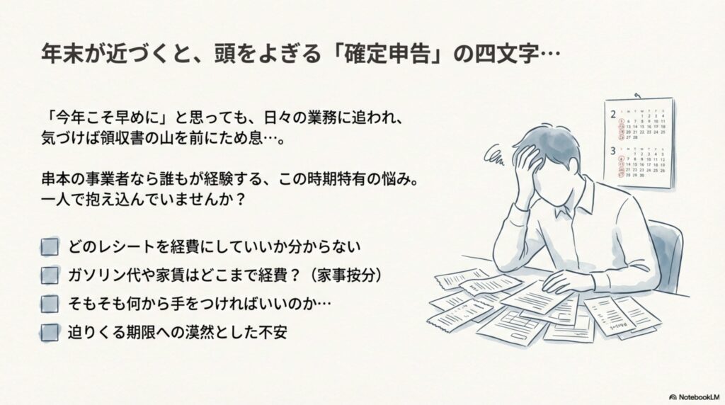多くの事業者さんが頭を悩ませるのが、やはり「書類の整理」と「経費の判断」です。例えば、「店の備品を買ったレシートと、孫にお菓子を買ったレシートが混ざってしまって、どれを経費にしていいか分からなくなった」。あるいは、「ガソリン代は仕事でも使うけれど、買い物にも行くから全額経費にしていいのか不安だ」というお悩みなど、多々あると思います。