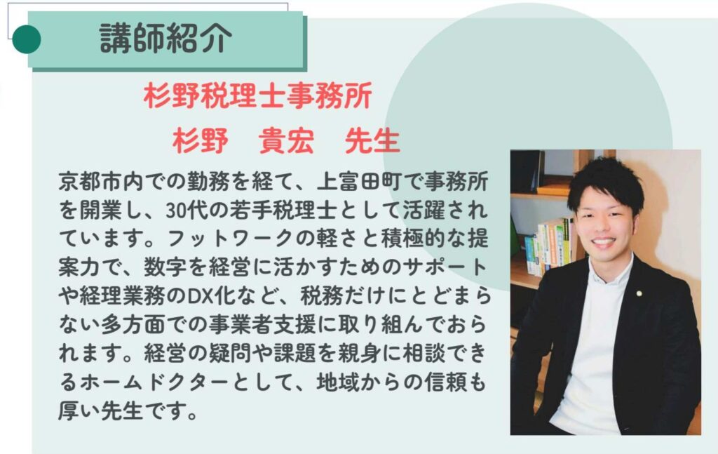 今回、講師としてお招きするのは、近隣の上富田町で開業されている杉野税理士事務所の杉野貴宏(すぎの たかひろ)先生です。30代という若さならではのフットワークの軽さと、親しみやすい人柄で、地域の方々からは「経営のホームドクター」として頼りにされています。