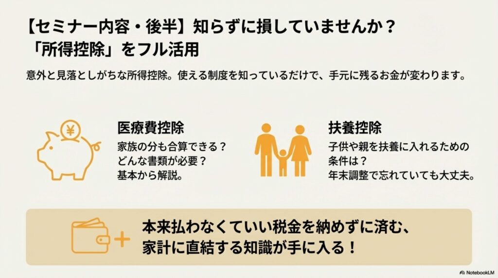 後半は、「所得控除」のお話です。ここ、意外と見落としがちなんですよ。「医療費控除」や「扶養控除」など、使えるはずの控除を知らずに申告してしまうと、本来払わなくていい税金まで払うことになりかねません。「どんな書類を揃えておけば医療費控除が受けられるのか」「子供や親を扶養に入れるための条件は何か」など、家計に直結する大切な知識を持ち帰っていただきます。