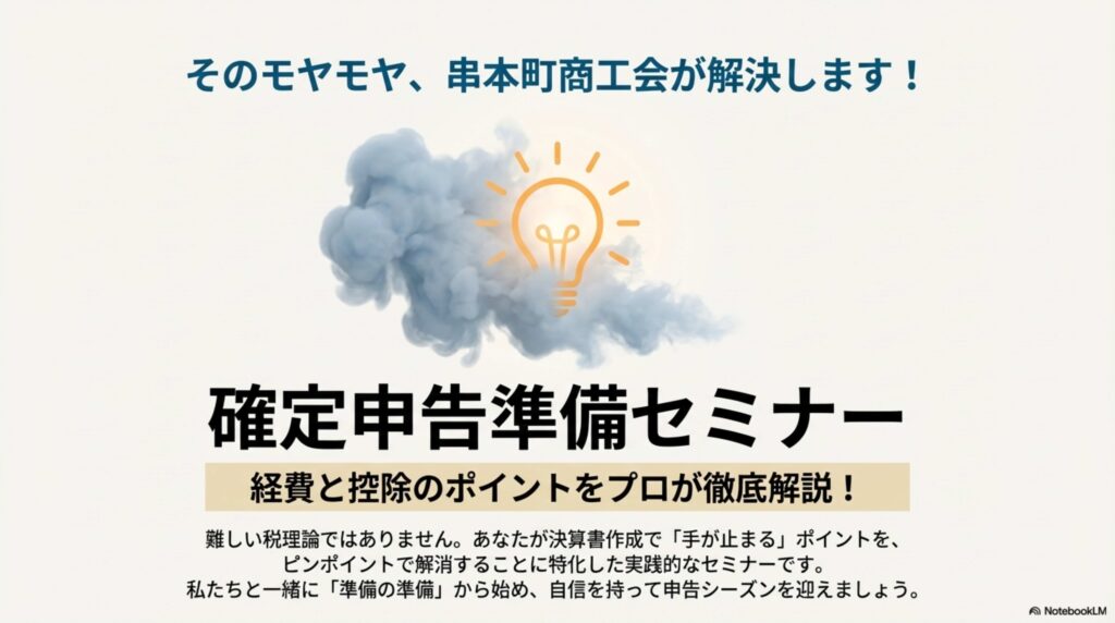 今回の「確定申告準備セミナー」は、これまでのセミナーとは一味違います。難しい税金の理屈を並べるのではなく、皆さんが実際に決算書を作る時に手が止まってしまうポイントを、ピンポイントで解決することに特化しています。