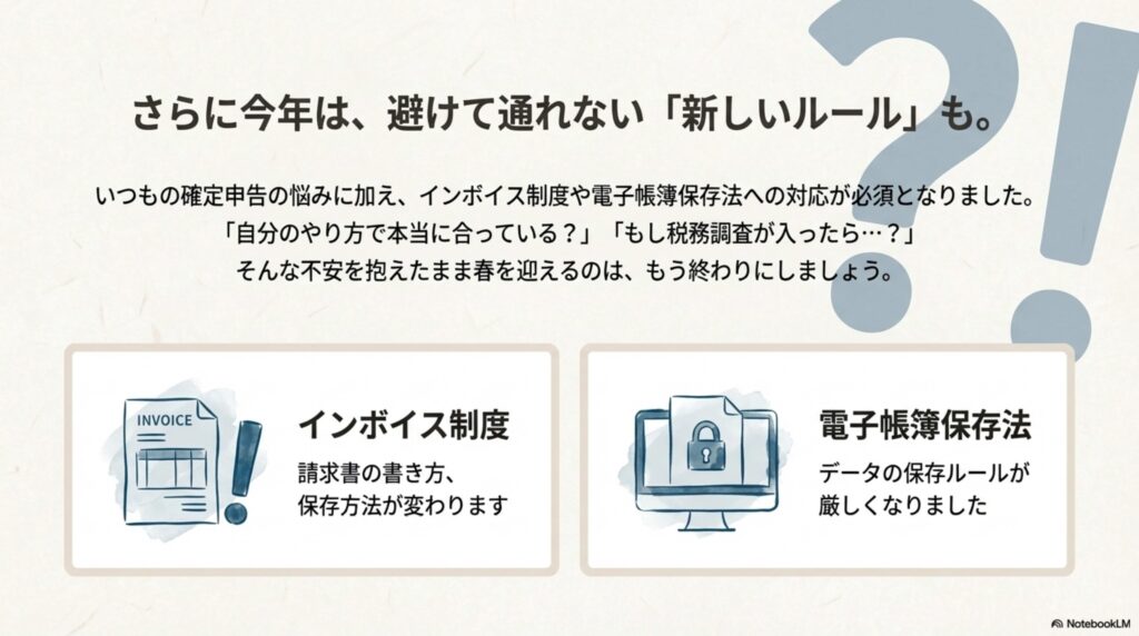 特に今回は、インボイス制度や電子帳簿保存法など、新しいルールへの対応も重なり、「何から手を付ければいいのか分からない」「自分のやり方で合っているのか不安」と感じている方も多いのではないでしょうか。
