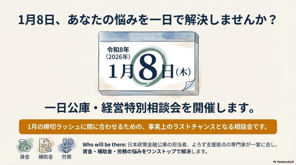 日本政策金融公庫の担当者や、よろず支援拠点の専門家が一堂に会します。1月の締め切りラッシュに間に合わせるための、事実上のラストチャンスとなる相談会です。