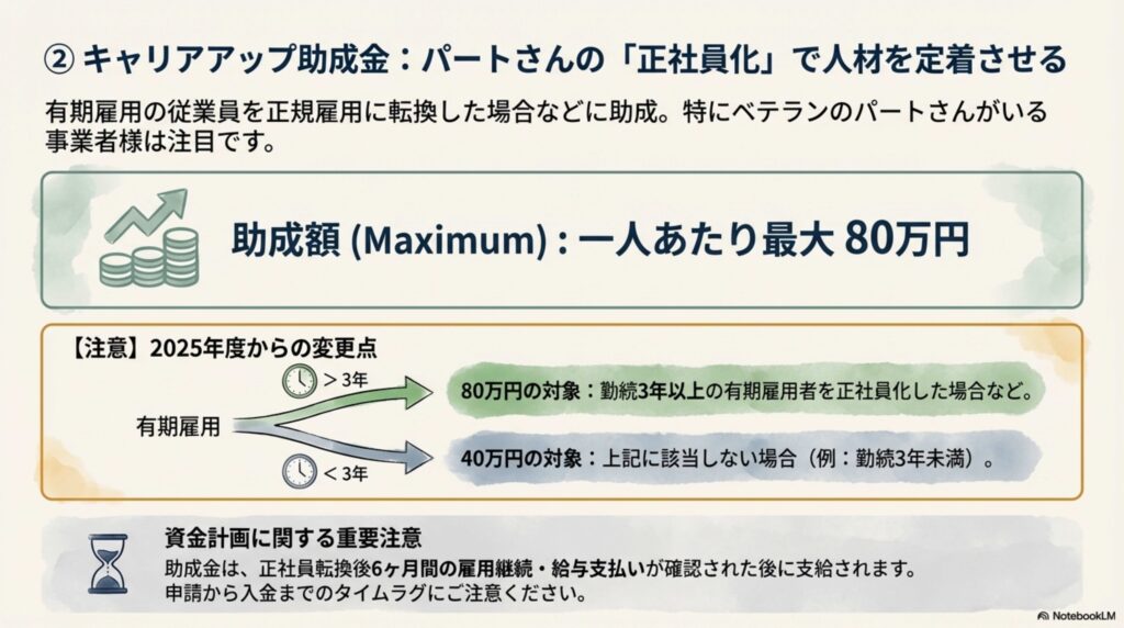 串本町の観光業やサービス業で、長く働いてくれているベテランのパートさんがいれば、この80万円コースの対象になる可能性があります。逆に、採用して間もない方(3年未満)の正社員化は40万円となりますので、試算の際はご注意ください。
