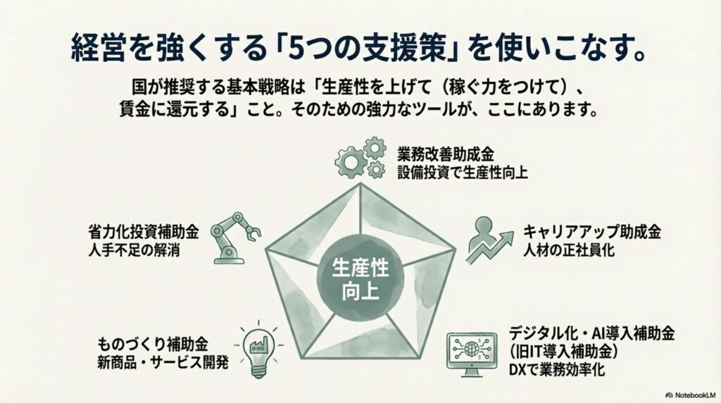「賃金を上げたくても原資がない」。その悩みを解決するために、国は「生産性を上げて(稼ぐ力をつけて)賃金に還元する」取り組みを強力にバックアップしています。