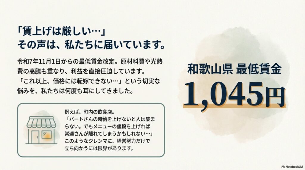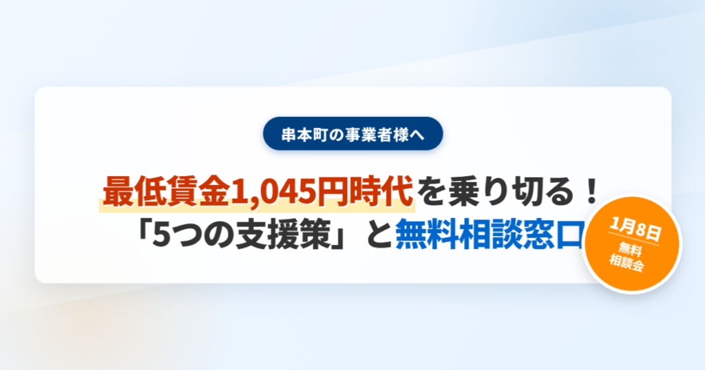 令和7年(2025年)11月1日から、和歌山県の最低賃金は時間額1,045円に改定されました。前年からの大幅な引き上げは、私たち串本町の小規模事業者にとって、まさに経営を揺るがす大きな課題です。特に、原材料費や光熱費の高騰も続く中での人件費アップは、利益を直接圧迫します。