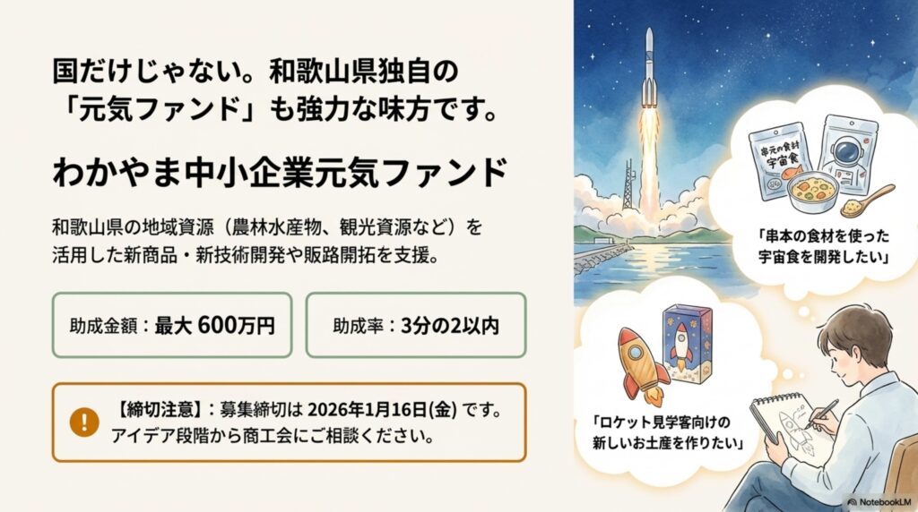 助成金額は最大600万円(助成率3分の2以内)と手厚く、串本町の事業者にとっても非常に魅力的な制度です。「串本の食材を使った宇宙食を開発したい」「ロケット見学客向けのお土産を作りたい」といった、地域ならではのアイデアをお持ちの方にはぴったりです。