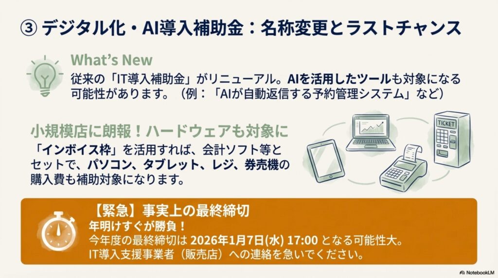 今年度のインボイス枠などの最終締切は2026年1月7日(水)17:00となる可能性が高いです。年明けすぐが事実上のラストチャンスです。もし活用を検討されているなら、大至急、IT導入支援事業者(販売店)に連絡を取り、申請手続きを進める必要があります。