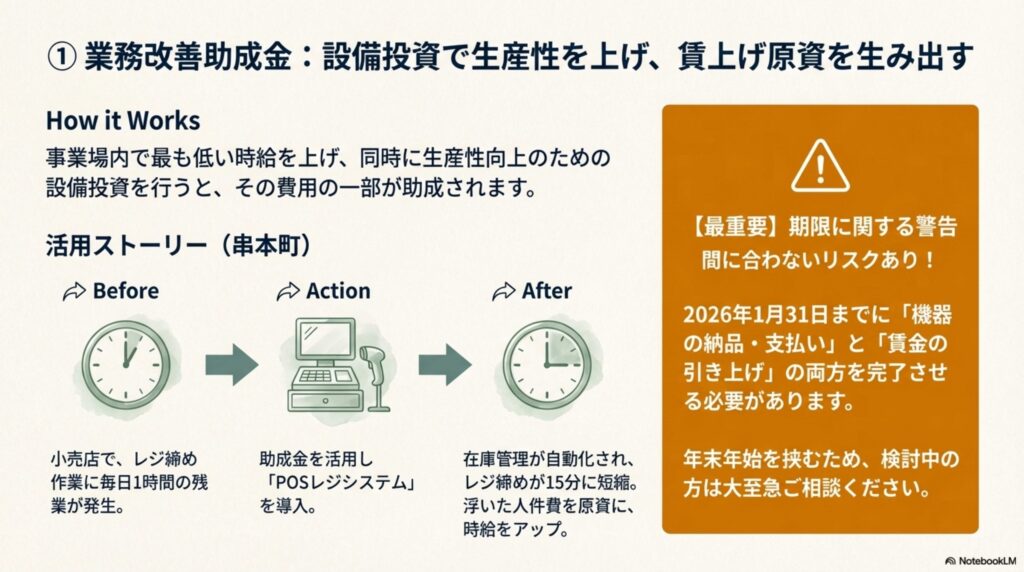 まず最初に検討していただきたいのが、厚生労働省の「業務改善助成金」です。この制度は、事業場内で一番低い時給(事業場内最低賃金)を一定額以上引き上げ、それと同時に生産性向上のための設備投資を行った場合に、その設備費用の大部分を国が助成してくれるというものです。