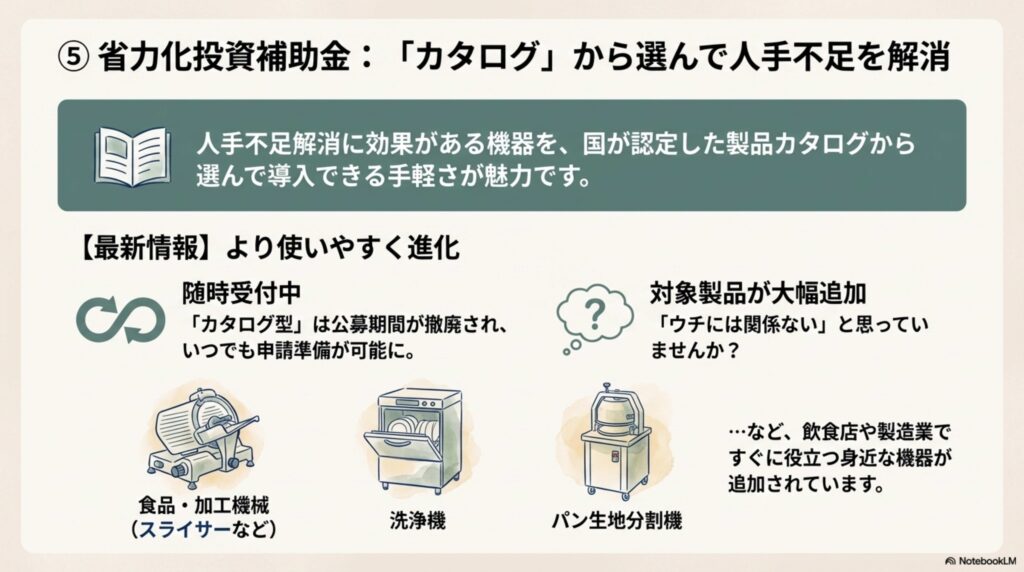最後にご紹介するのは、「中小企業省力化投資補助金」です。人手不足解消に効果があるロボットやIoT機器を、「カタログ」から選んで導入できる手軽さが特徴です。