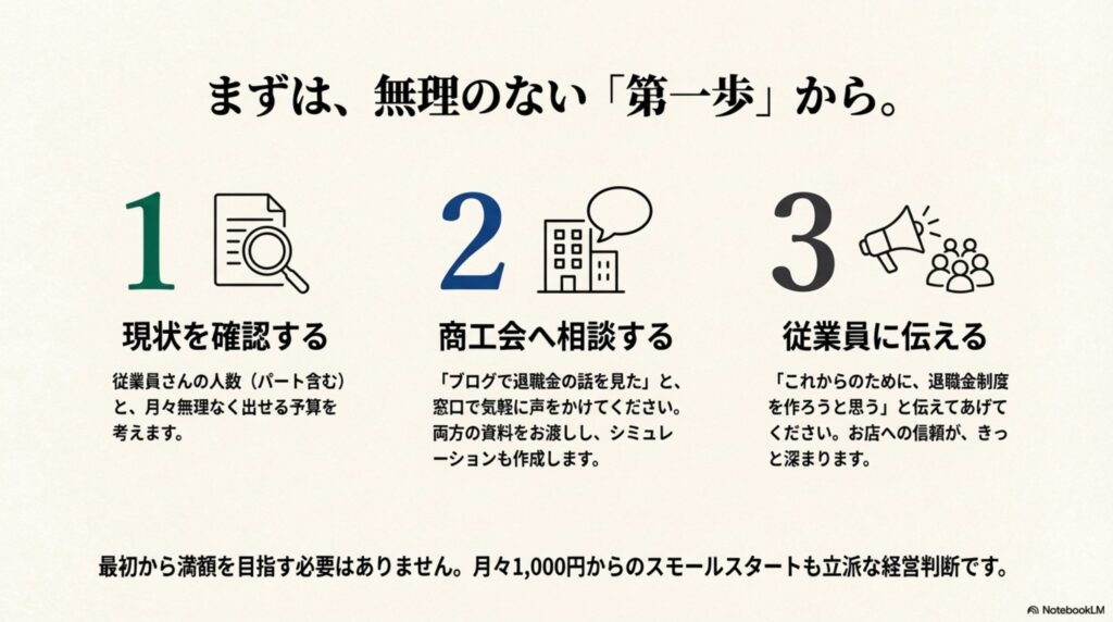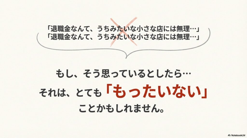 「退職金なんて、大企業の話でしょ? うちみたいな小さな店には無理だよ」 もしそう諦めているとしたら、実はとても「もったいない」ことをしているかもしれません。