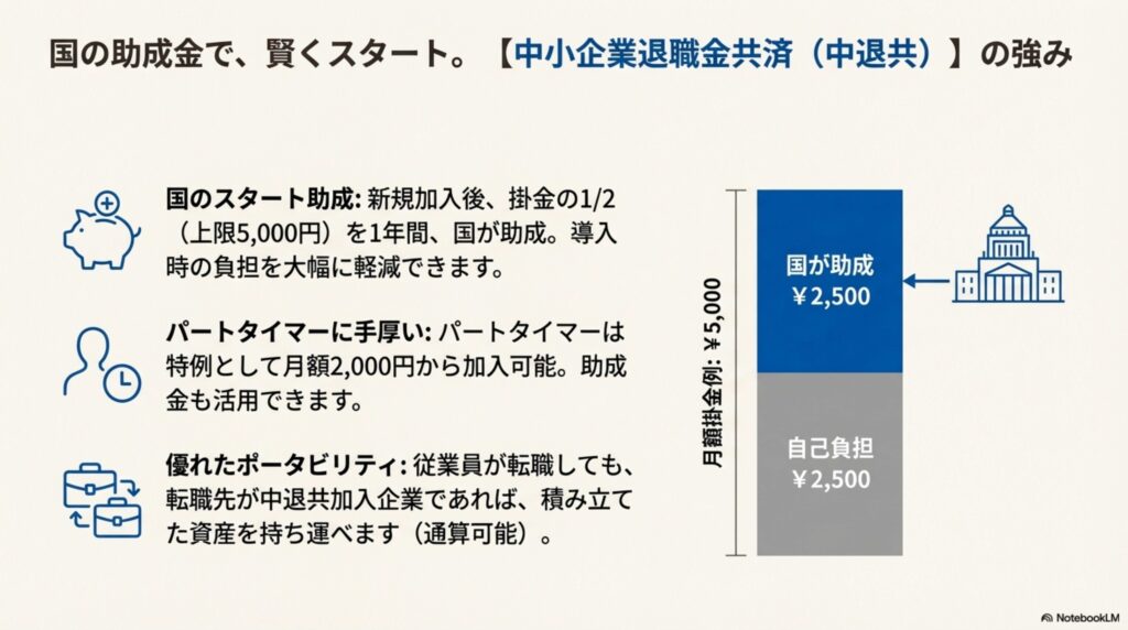一方、国が運営しているのが「中小企業退職金共済(中退共)」です。 こちらの最大の強みは「助成金」があることです。新しく加入する場合、掛金の2分の1(上限5,000円)を加入後4ヶ月目から1年間、国が助成してくれるため、スタート時の負担を大幅に減らせます。 掛金は原則として月額5,000円からですが、パートタイマーの方などは特例で月額2,000円から加入できる場合もあります。