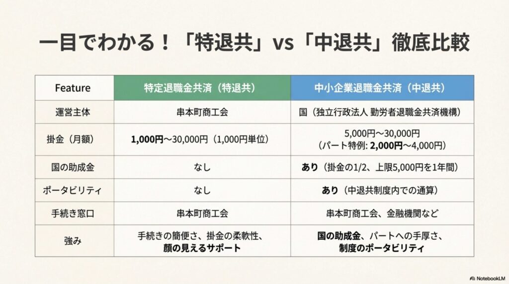いざ「退職金制度を始めよう」と思った時、最初によくご質問いただくのが、「商工会の制度(特退共)」と「国の制度(中退共)」の違いについてです。 どちらも従業員さんのための素晴らしい制度ですが、それぞれに「得意分野」が異なります。