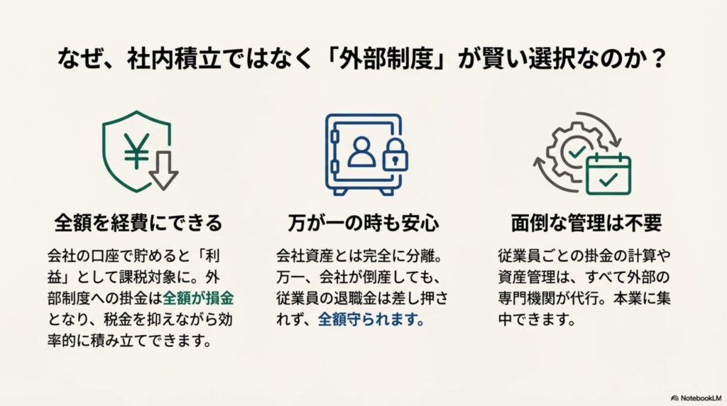 つまり、自分で貯めるよりも「会社にお得で、従業員に安心」なのが、外部制度を使う大きなメリットなのです。