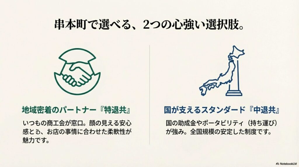 実は、従業員1人あたり月々1,000円という低コストから、立派な退職金制度を作る方法があるのをご存知でしょうか? この記事では、私たち串本町商工会が、地元の小規模事業者にこそおすすめしたい「2つの退職金制度(特退共・中退共)」について、その違いや選び方を分かりやすく解説します。