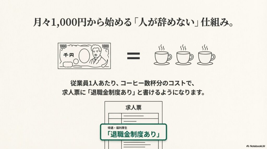 「でも、毎月掛け金を払う余裕なんてないよ」と不安に思われる方もいらっしゃるでしょうか。 ご安心ください。商工会がご案内している制度なら、従業員一人あたり月々1,000円から積み立てることができます。 月々わずかコーヒー数杯分のコストで、求人票に「退職金制度あり」と書けるようになるのです。これは、お店の信頼度を上げるための「必要経費」と考えても、決して高いものではないはずです。