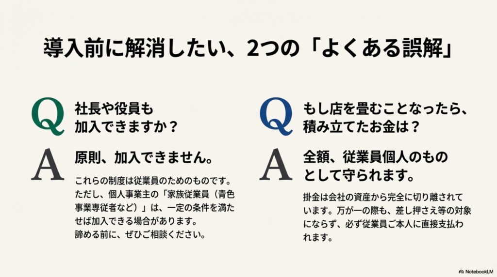 退職金制度には、いくつか「誤解されやすいポイント」があります。後で「知らなかった!」とならないよう、特によくある2つの疑問にお答えしておきます。