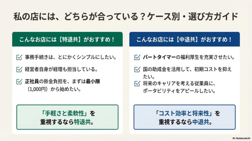 ここが少しややこしいのですが、重要なポイントです。 中退共はパート特例を使えば月2,000円から加入でき、さらに国の助成金も使えます。ですので、パートタイマーの方を中心に加入させるなら中退共がお得です。 一方、フルタイムの従業員の場合、中退共は原則月5,000円からのスタートになりますが、特退共なら月1,000円から設定できます。ですので、フルタイムの方の掛金負担を最小限に抑えたい場合は、特退共の方が安く済みます。