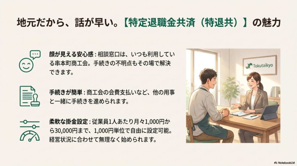 まず、私たち串本町商工会が窓口となっているのが「特定退職金共済(特退共)」です。 最大の特徴は、何と言っても「顔が見える安心感」と「手続きの簡単さ」ですね。商工会の会費と一緒に手続きができますし、分からないことがあれば、いつもの商工会職員に直接ご相談いただけます。また、掛金も1,000円単位で細かく設定できるので、お店の懐事情に合わせて無理なく始められるのが魅力です。