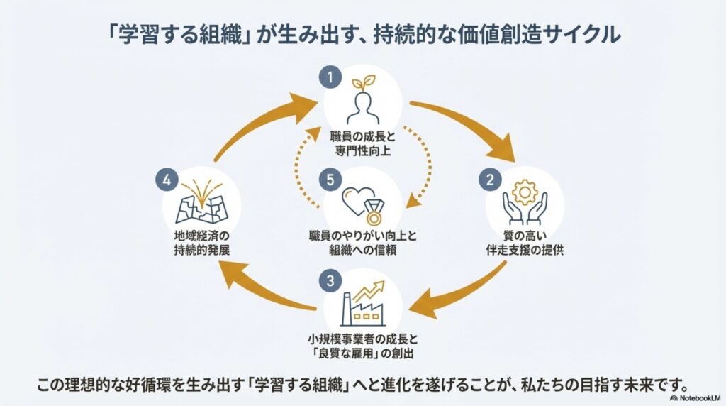 これらの施策により、経営支援センターと商工会は、職員の成長が質の高い伴走支援となり、小規模事業者の「良質な雇用」創出と地域経済の持続的発展に貢献するという、理想的な好循環を生み出す学習する組織へと進化を遂げる。
