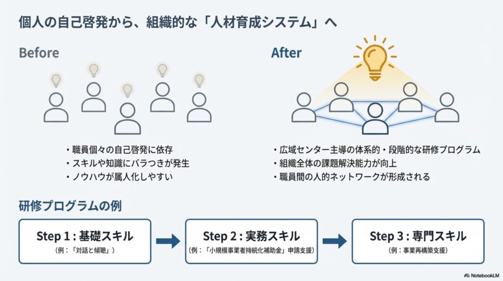 • 戦略:広域連携による体系的な研修プログラムの構築: 広域センターが主体となり、管轄内の全商工会職員を対象とした段階的な研修プログラム(基礎スキルとしての「対話と傾聴」、実務スキルとしての「小規模事業者持続化補助金」申請支援など)を企画・実施する。これにより、組織全体の課題解決能力向上と、職員間の人的ネットワーク形成を促す。