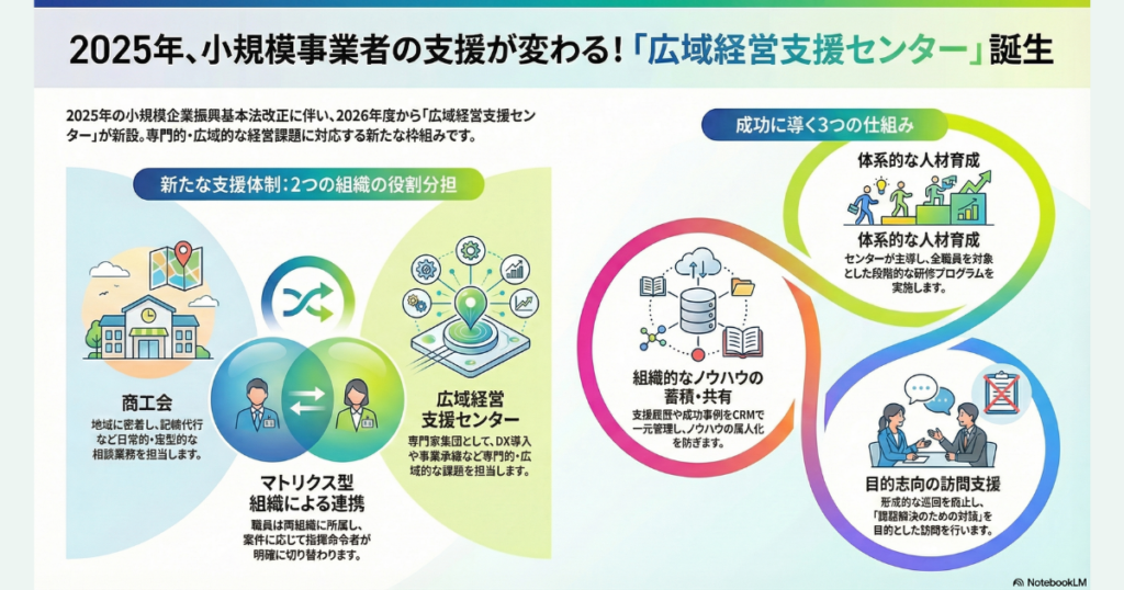 2025年小規模企業振興基本法改正は、「広域連携による経営支援センター」という新たな枠組みを導入し、複雑化・高度化する小規模事業者の経営課題に対応するための画期的な転換点となる。この取り組みは2026年度から実施される予定であり、今回はその「役割と効果」、「職員重視の組織運営」、「職員スキルアップ」、「会員事業所のノウハウ取得」について概略を説明します。