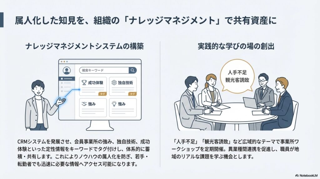 • ナレッジマネジメントシステムの構築と活用: CRMシステムを発展させ、会員事業所の強み、独自技術、成功体験といった定性情報をキーワードでタグ付けして体系的に蓄積・共有する「ナレッジマネジメントシステム」を構築。ノウハウの属人化を防ぎ、若手・転勤者への迅速な情報提供を可能にする。