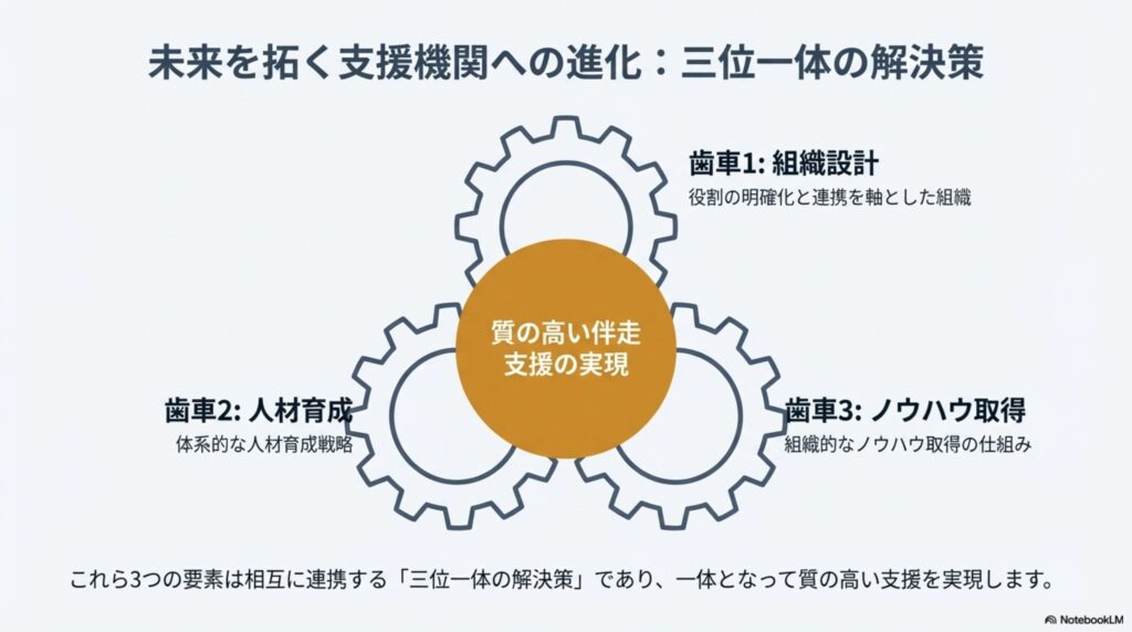「役割の明確化と連携を軸とした組織設計」「体系的な人材育成戦略」「組織的なノウハウ取得の仕組み」は相互に連携する三位一体の解決策である。