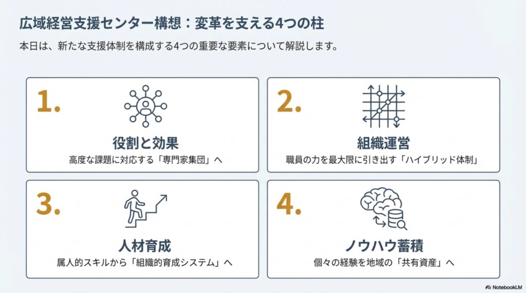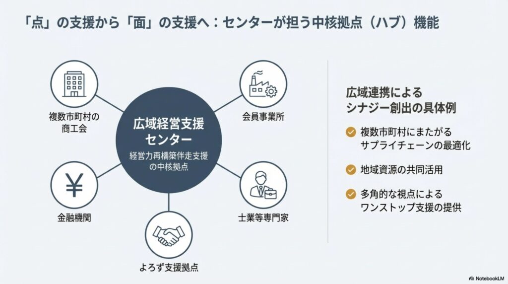 • 広域連携によるシナジー創出: 複数の市町村にまたがるサプライチェーンの最適化や地域資源の共同活用を可能にする。「経営力再構築伴走支援」のハブ(中核拠点)となり、金融機関や士業などの外部支援機関との連携を強化し、多角的なワンストップ支援を提供する。