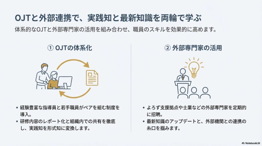 • 戦術:OJTと外部専門家活用のハイブリッド型育成: 経験豊富な指導員と若手職員がペアを組むOJTを体系化し、研修内容のレポート化と共有を徹底する。よろず支援拠点や士業などの外部専門家を定期的に招聘し、最新知識のアップデートと連携の糸口を掴む。