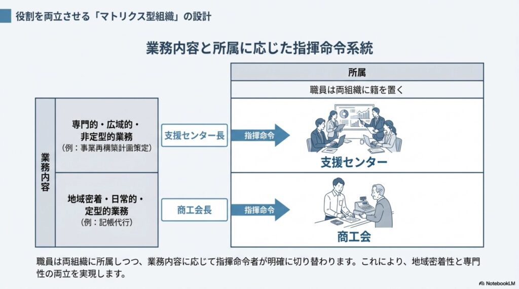 • 職員は両組織に籍を置きつつ、業務内容に応じて指揮命令者(商工会長 or 支援センター長)が明確に切り替わる「マトリクス型組織」を導入する。
