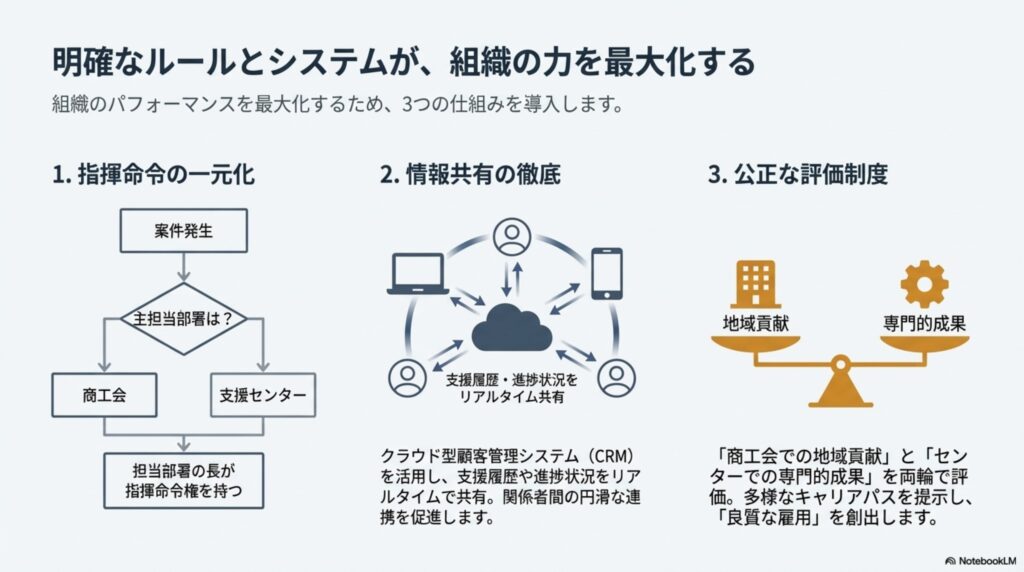 • 職員の評価制度とキャリアパスの整備: 商工会での地域貢献とセンターでの専門的プロジェクトの成果を両輪で評価する人事評価制度を設計する。「地域密着支援のスペシャリスト」と「広域課題解決の専門家」のキャリアパスを明確化し、「良質な雇用」を創出・定着させるための戦略的ツールとする。