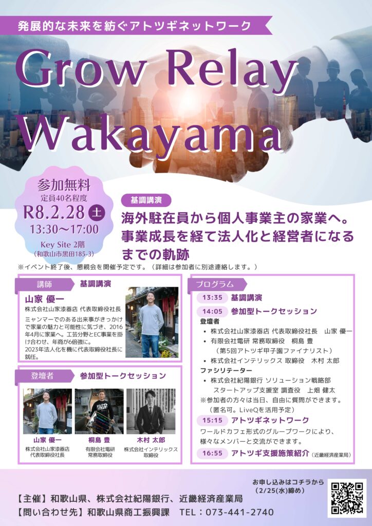 今回ご案内するのは、そのような前向きな視点で事業承継を捉え直すためのイベント「Grow Relay Wakayama(グロウ リレー ワカヤマ)」です。