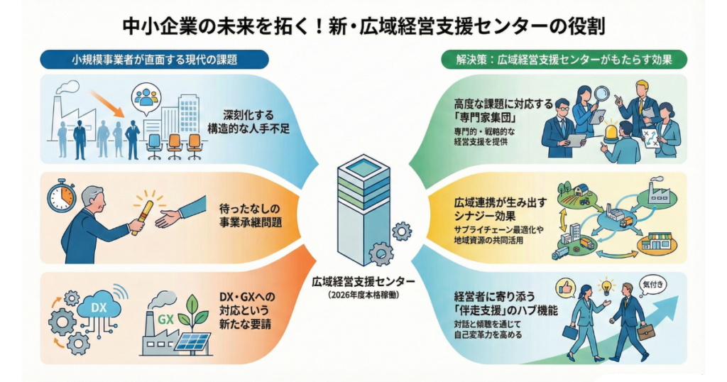 1月号でもお伝えしたように、2025年の小規模企業振興基本法改正により、「広域連携による経営支援センター」という新たな枠組みが導入されます。これは、複雑化・高度化する小規模事業者の経営課題に対応するための画期的な転換点となることが期待されています。